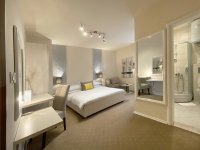 Air-conditioned room featuring a flat-screen cable TV, work-desk, central heating system including floor heating Hardwood/Parquet or carpeted floors and an en-suite bathroom offering a shower and hairdryer.